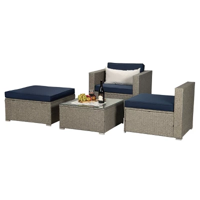 - ✶ DURABLE MATERIAL – Patio sectional sofa is made of premium gray mix yellow poly rattan, sturdy metal frame with black powder coating and waterproof navy cushions & beige pillow. Based on excellent water and weather resistance, patio wicker furniture can be used well both indoor and outdoor.