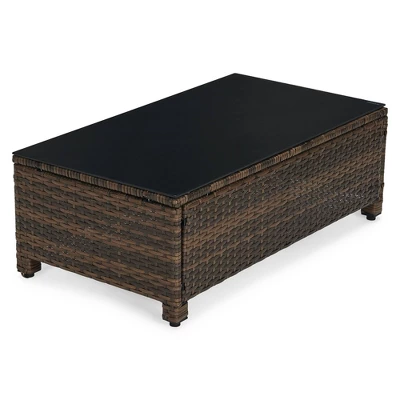 This 4-piece outdoor sectional sofa set creates a comfortable and relaxing extension of your home into the outdoors. It includes an armchair, a sectional sofa, an ottoman, and a coffee table, all built with a UV-, water-, and rust-resistant metal frame that’s wrapped in resin wicker for a breezy aesthetic. The chairs and sofa feature track arms to create a modern silhouette. The included cushions are filled with foam for just the right amount of support as you sit. Completing the set is the glass-topped coffee table that’s easy to clean, and provides an ideal spot to rest a tray of snacks.