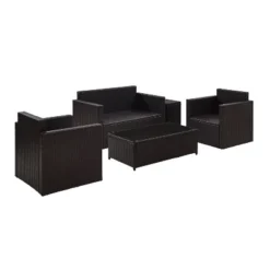 This 4-piece outdoor sectional sofa set creates a comfortable and relaxing extension of your home into the outdoors. It includes an armchair, a sectional sofa, an ottoman, and a coffee table, all built with a UV-, water-, and rust-resistant metal frame that’s wrapped in resin wicker for a breezy aesthetic. The chairs and sofa feature track arms to create a modern silhouette. The included cushions are filled with foam for just the right amount of support as you sit. Completing the set is the glass-topped coffee table that’s easy to clean, and provides an ideal spot to rest a tray of snacks.