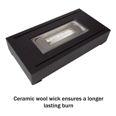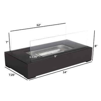 - PRODUCT DETAILS – Materials: Steel, Tempered Glass, and Wool Wick. Dimensions: (L) 14″ x (W) 7.25″ x (H) 8″; Panes: (L) 12″ x (H) 7″; Burner: (L) 5″ x (W) 1.13″. Metal Flame Snuffer Included. Fuel Capacity 140mL (Not Included). Color: Black.
