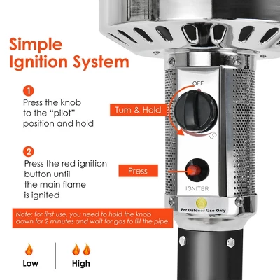 This patio propane heater is a great choice for you, which will extend your outdoor entertaining season and allows you to enjoy nature’s beauty even through chilly autumns and nippy winters. The reflector is 32’’ in diameter and can spread a wide, comfortable warmth throughout the surrounding area. Besides, you just need to press the ignition button to light this heater, and you can adjust the temperature from low to high as needed. Equipped with 2 wheels on the bottom, this patio heater allows you to move it effortless. In addition, the trip-over protection design and 3 stakes improve overall stability and safety.