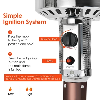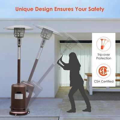This patio propane heater is a great choice for you, which will extend your outdoor entertaining season and allows you to enjoy nature’s beauty even through chilly autumns and nippy winters. The reflector is 32’’ in diameter and can spread a wide, comfortable warmth throughout the surrounding area. Besides, you just need to press the ignition button to light this heater, and you can adjust the temperature from low to high as needed. Equipped with 2 wheels on the bottom, this patio heater allows you to move it effortless. In addition, the trip-over protection design and 3 stakes improve overall stability and safety.
