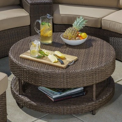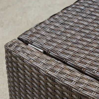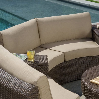 Create the outdoor entertaining space you’ve always dreamed of with the Cyprus Curved Sectional. Use all the pieces together to make one large sectional or break them apart to make smaller seating spaces. The brown wicker and Heather Beige Sunbrella fabric compliments each other perfectly. The set includes seating for six, 3 side tables and a coffee table. The side tables open for storage of pillows, blankets, etc. Add in your own toss pillows and accessories to make this set a true representation of your style. The frames are all powder coated aluminum, the wicker is all artfully hand woven and the fabrics are all Sunbrella. The seating set has a 3 year limited warranty.