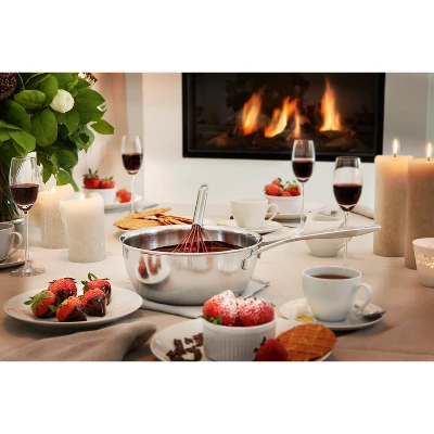 The 3.5-quart Essential Pan is the go-to for simmering soups, reducing savory sauces, cooking fluffy risotto, and more. The flared walls help prevent grains from lodging in corners, while the wide mouth facilitates quicker sauce reduction, and makes frequent stirring a breeze. Boasting a sturdy 5-ply construction and a thick aluminum core, DEMEYERE Industry is designed for perfect browning, offering superior heat retention and even heating. Signature flat base technology makes it fully induction compatible and hot-spot free no matter what stovetop you cook on.Other chef-friendly features include dripless pouring rims and ergonomic stay-cool handles that are welded so they are ultra-secure. And because there are no rivets for grease to collect around, they’re exceptionally hygienic. The patented Silvinox surface treatment on DEMEYERE cookware maintains a flawless, silvery white finish that’s easy to clean and more resistant to fingerprints, harsh detergents, and strong acidic foods, even after years of use.