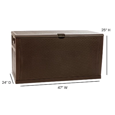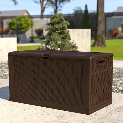 Unclutter your space and quickly find what you’re looking for when you organize all of your deck, patio, and backyard items in this 120 gallon plastic deck box. The woven motif mimics wicker and can blend seamlessly in any environment while the chest design can provide extra seating up to 180 lbs static weight capacity. An included floor panel helps this deck storage box protect your chair cushions, garden tools, or your children’s toys from the elements when not in use. This multipurpose storage box can also be used indoors for storing extra linens, out of season clothing, or in the garage for extension cords, life jackets, and other miscellaneous items that always seem to find their way to the garage. Thoughtful storage solutions help your indoor or outdoor space regain an organized appearance to create a calm, restful atmosphere. Constructed of durable polypropylene, the weatherproof body allows rainwater to shed without reaching your belongings and will hold up to -4 degrees without cracking. Although the product material is waterproof, there may be gaps due to assembly. Do not store objects that may be damaged by moisture. Fade, dent and rust resistant, this heavy duty outdoor storage deck box will hold up to 220 lbs. weight capacity. Brilliantly designed with a “snap-together” frame, and no tools required, your patio storage box will be assembled and ready to use in under 10 minutes. Add a padlock (not included) to keep your stored items secure. The versatility of this extra large weather resistant storage deck box makes it a fabulous addition to any home or business.