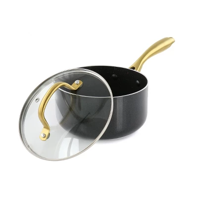Have your kitchen essentials ready with this Gibson Home Ellsworth 2.5 Quart Aluminum Nonstick Saucepan With Lid. With a gorgeous golden handle and elegant black and gold speckled interior, this pan is just as great to look at as it is to use. This pan is perfect for new home owners or even those looking to upgrade their cookware. Nonstick interior and ergonomic handles makes it super easy and convenient to use. Tempered glass lid allows you to safely watch your food while it’s cooking. Although dishwasher safe, it’s highly recommended to hand wash as extensive use of detergents may cause surfaces to dull.