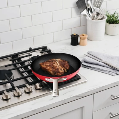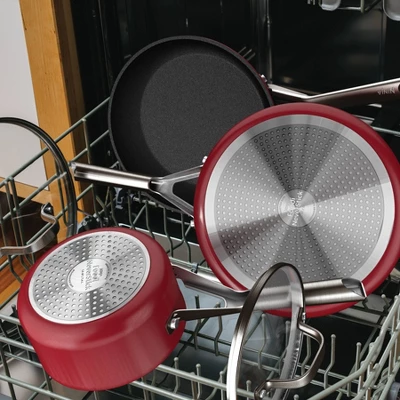 Ninjaâ„¢ Foodiâ„¢ NeverStick® Cookware is the cookware that won’t stick, chip, or flake. With a max manufacturing temperature of 30,000°F, our cookware won’t rapidly lose nonstick like traditional pans made at 900°F can. Designed to withstand high-heat cooking and aggressive scrubbing. Our exclusive coating is metal-utensil safe and dishwasher safe. This cookware has a glossy red exterior that is easy to clean. Oven safe to 500°F. All range capable: gas, electric, glass ceramic, and induction. Sear, sauté, griddle, pan fry, bake, roast, broil. Fully backed by Ninjaâ„¢ 10 Year Guarantee.
