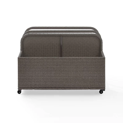 Keep your poolside fun organized with the Palm Harbor Float Caddy. Made from all-weather resin wicker over powder-coated steel, this mobile organizer has casters that lock for stability. One open side with two large wicker wrapped bars can corral larger items like pool floats and folding tables, while the other side features a large basket for smaller items like pool toys and pillows. Outdoor fun will always be close at hand with the Palm Harbor Float Caddy.