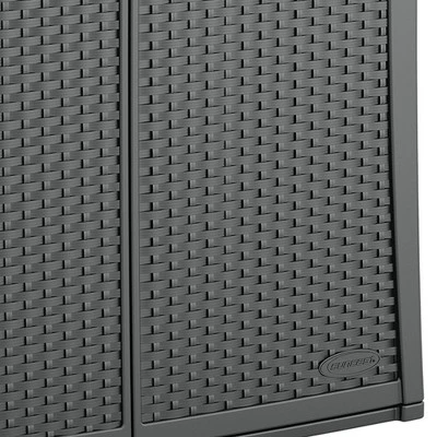 Neatly store your lawn and garden tools and accessories while adding a sophisticated style to your deck or patio with this 2-pack of Suncast Lockable Outdoor Cabinet Deck Storage Boxes, the ultimate solution for your outdoor storage needs.Offering a 97-gallon interior capacity, these cabinets are large enough to accommodate lawn and garden tools, grill accessories, and more. The included metal-reinforced, adjustable shelves further increase your organizational opportunities. Durable plastic construction is accented by sturdy, pad-lockable doors that provide superior strength and security (lock not included) and the wicker design looks great in any outdoor setting.These patio storage cabinets are weather, water, and rust-proof, ensuring long-lasting use, while their compact sizes make it easy to blend in with your existing outdoor decor. The storage bins are also easy to assemble and maintain. Simply wipe them down with a damp cloth to keep them looking clean and new.Increase your storage capacity while beautifying your space with this 2-pack of Lockable Outdoor Cabinet Deck Storage Boxes, and enjoy a clutter-free outdoor space.