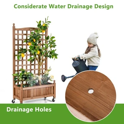 Our planters are made from high quality fir wood, 100% natural material. 6.5 “depth is enough to hold 66lbs of soil to grow fruits, flowers, or vegetables. The Planter trellis can be hung with plants up to 11lbs and can accommodate some vines. Nails are inserted into every joint to keep the trellis from becoming deformed. The water drainage hole at the bottom of the Planter bed give the plants a better environment to grow and prevent root rot. The lock wheel at the bottom allows the planter to move more easily and can be placed outdoors in sunny days or indoors in bad weather. If you are a gardening enthusiast, you must not miss this planter.